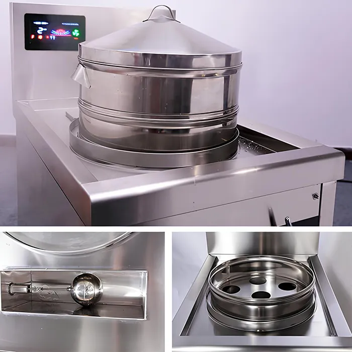 Bếp hấp Dimsum điện từ công nghiệp này được thiết kế để hấp bánh bao, momo, há cảo, mì gạo, bánh và các loại thực phẩm khác. Nó có cơ chế kiểm soát mực nước tự động, cũng như chức năng an toàn của hệ thống báo động mực nước thấp và hệ thống ngắt điện khi gặp sự cố, có thể mang lại nhiều tiện lợi cho nhà hàng của bạn.