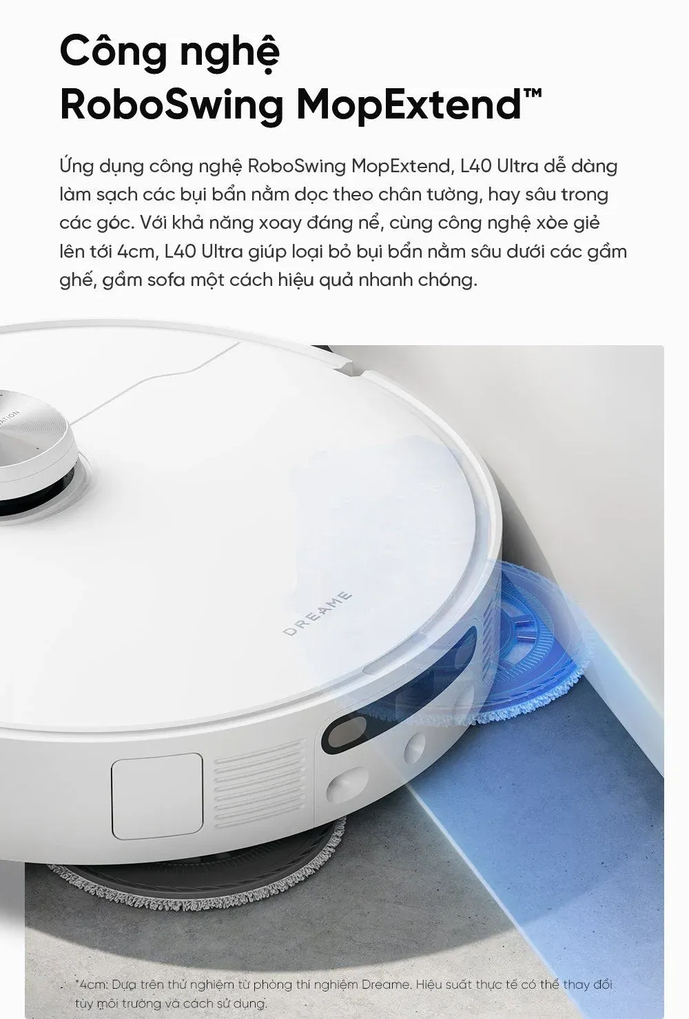 Robot được thiết kế với giẻ lau có khả năng nâng lên và tháo rời, cùng với công nghệ RoboSwing MopExtend™, cho phép giẻ lau mở rộng lên đến 4 cm, giúp làm sạch hiệu quả hơn, đặc biệt là ở những góc khuất.