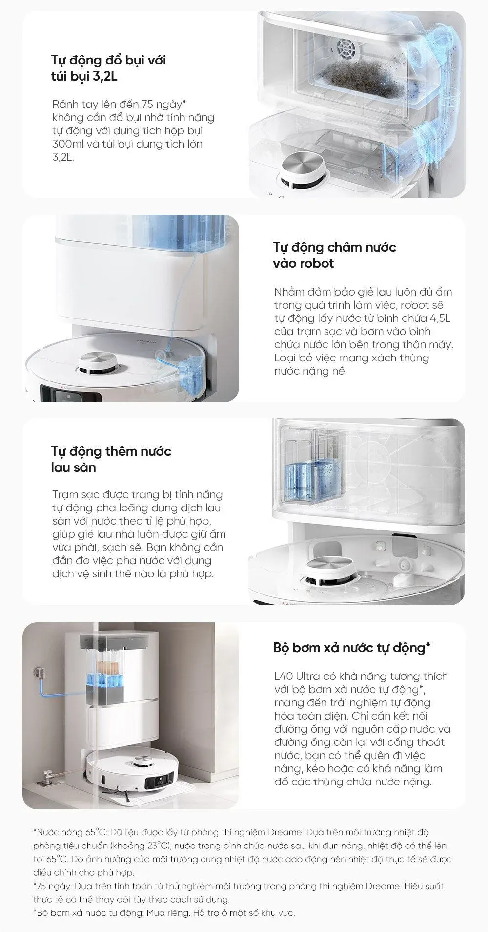 Một trong những điểm nổi bật của Dreame L40 Ultra là trạm sạc tự động với dung tích lớn. Ngăn chứa nước sạch lên tới 4,5L và ngăn chứa nước bẩn 4L giúp robot có thể hoạt động liên tục mà không cần phải làm đầy hay thay nước thường xuyên. Điều này mang lại sự tiện lợi tối đa cho người dùng.