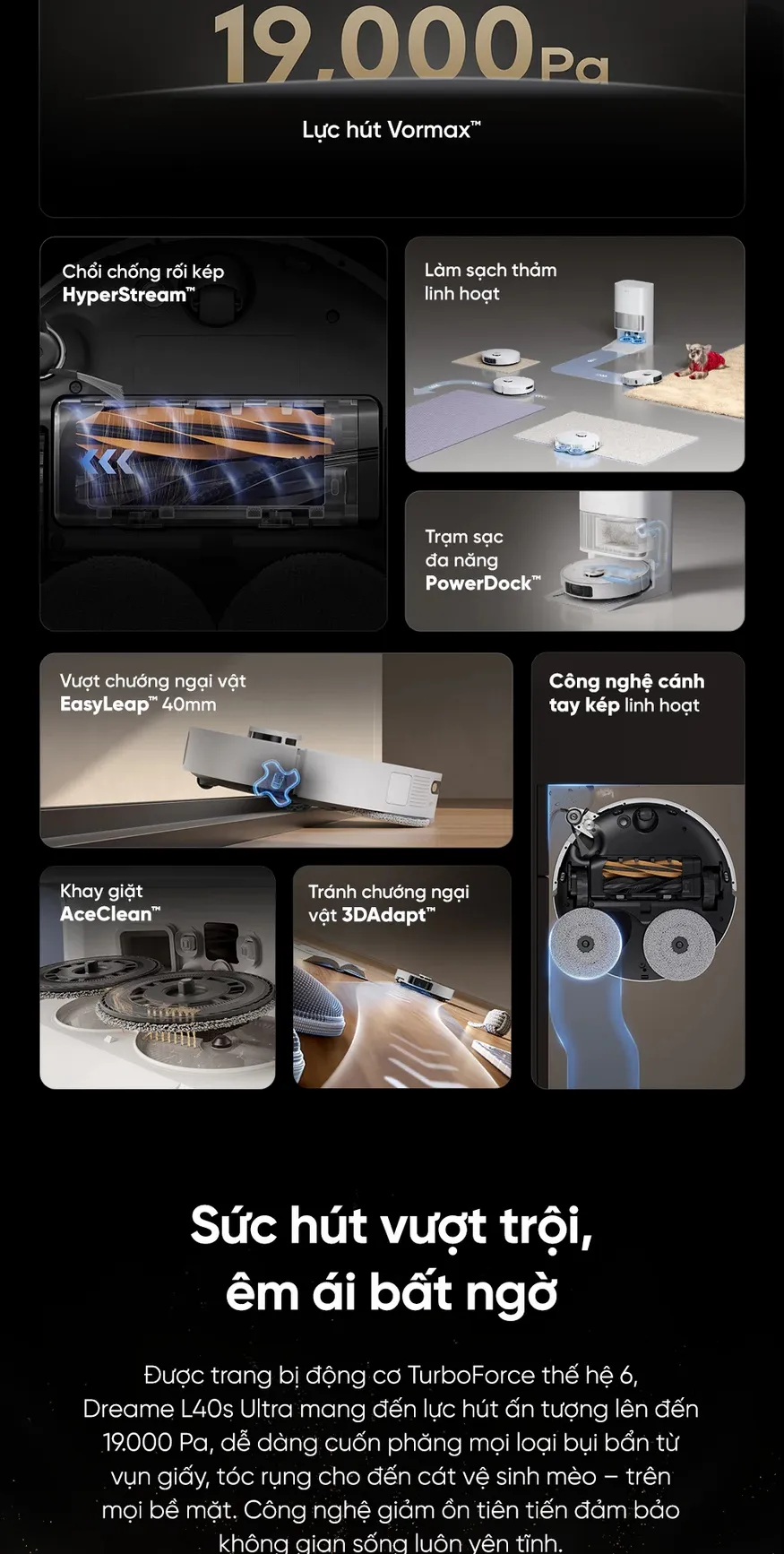 Được trang bị động cơ TurboForce thế hệ 6, Dreame L40s Ultra đạt lực hút tối đa 19.000Pa, dễ dàng loại bỏ bụi bẩn, rác vụn và lông thú cưng trên mọi bề mặt. Đồng thời, thiết kế tối ưu giúp robot vận hành êm ái, hạn chế tối đa tiếng ồn, phù hợp cho gia đình có trẻ nhỏ hoặc người cần không gian yên tĩnh.