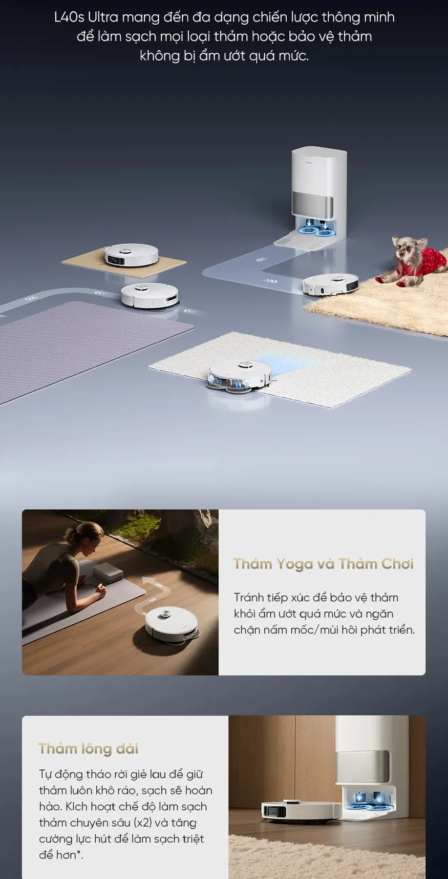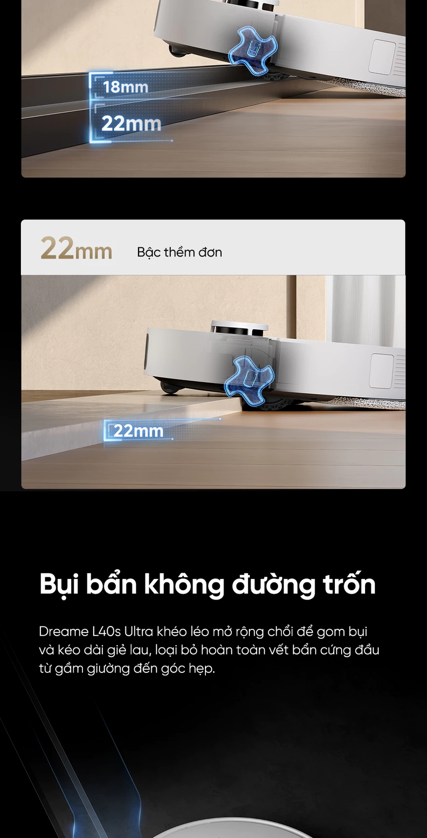 Với công nghệ tay kép, robot có thể mở rộng chổi cạnh đến 4cm, làm sạch sát tường, chân nội thất, và các khu vực hẹp. Khi phát hiện thảm, Dreame L40s Ultra tự động nâng giẻ lau lên 10,5mm để tránh làm ướt thảm, đồng thời hạ thấp chổi cạnh nhằm tối ưu khả năng làm sạch.
